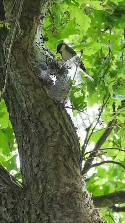 Op un takke van de iekenboom zit un paar holtdoeven. Un koolmees pikt de processierupse tussen de groem op de stamme van dezelfde iekenboom.