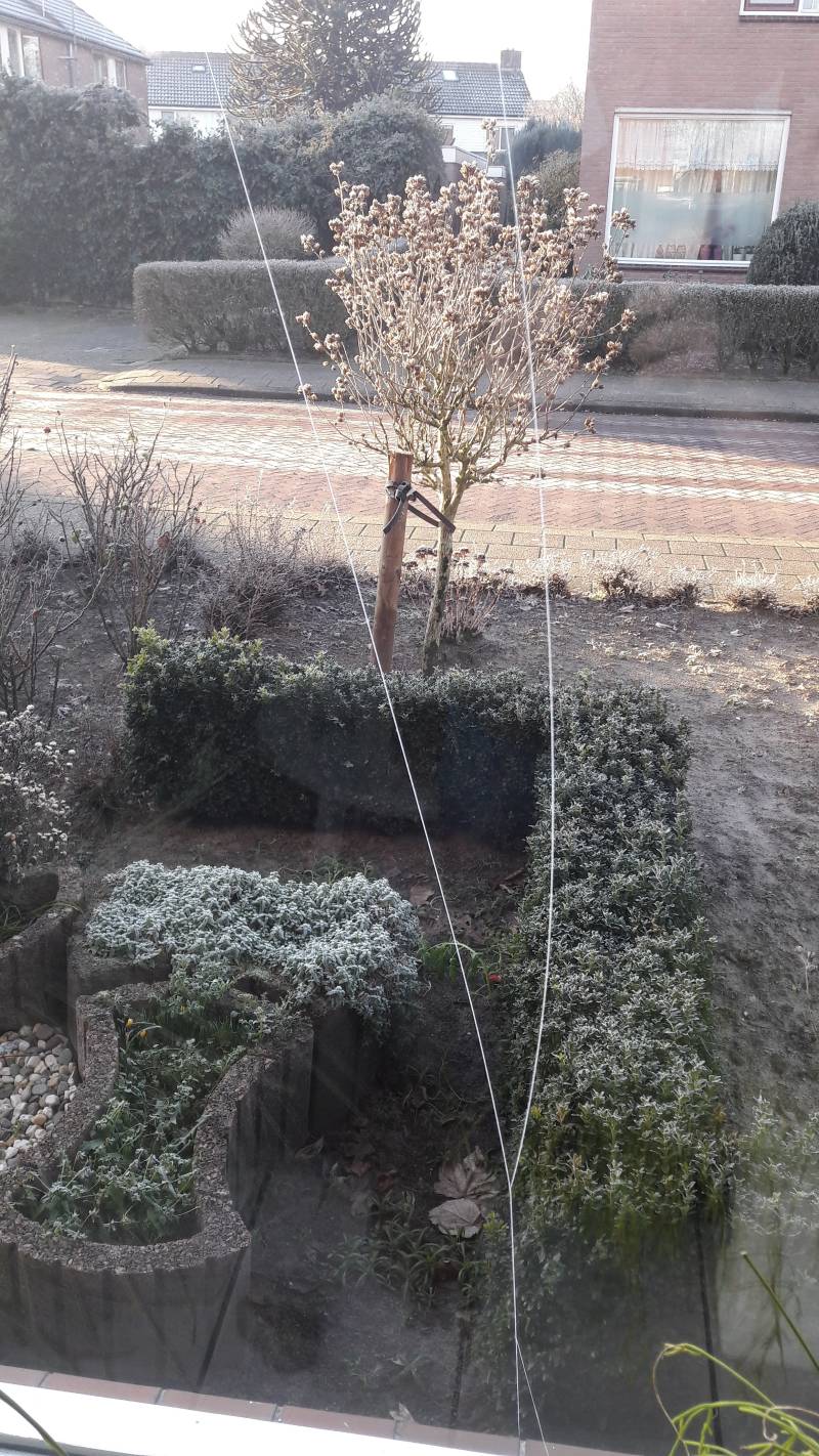 Ma vandaage was der iets wat aans aan de haand. Zatte net an de koffie toen ik na buuten keek. Ut zunnegie scheen lekker en de bevreuren blaagies glinsteren mie tegemoet. Ma toen zag ik wat aans. Ut leken weh twee touwgies die deur de wind hen en weer gingen.