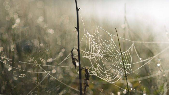 Toen ik better keek, deur het rolgedien omhoog te doene, zag ik dat ut un spinnenweb was. Mooi wit beveuren en ut raadsel was oppelöst.