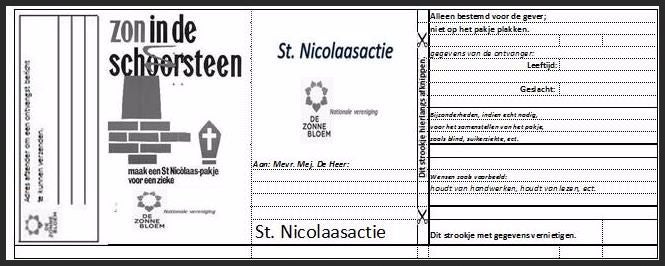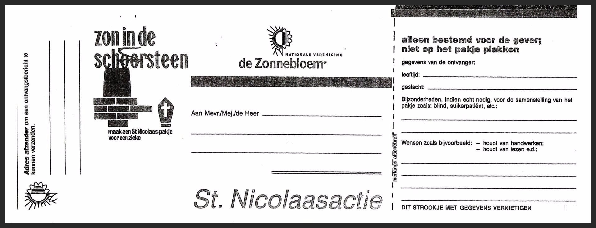 Dat achter de scharmen doar völle vrie-jwilligers met bezig bint. Vrogger gebeurn det allemaol met de haand. Naam’n uutzuuken, liesten maaken, streukies skriem en dan ok allemoal vot breng, noadat ze ok nog langs de deure waan e’wes of der luu waan, die dan een pakkie woln maaken veur un older iemand of veur eene met un lichaamelike beperking. Daagen waan ze doa druk met.