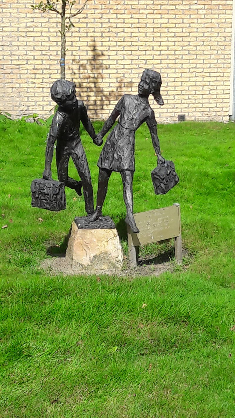 We gaan nu op weg naar de basisschool Op weg, waar een monument staat van spelende kinderen.