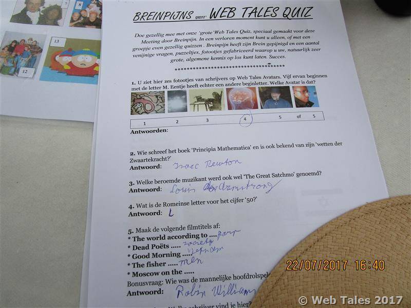 Fram had met enkele leden een puzzeltocht uitgezet en we moesten tien uitgedoste mensen van de verhalensite moesten we zoeken en een letter ontfutselen, wat later een gezegde moest vormen. Door te overleggen in teamverband kwam al snel het gevoel boven, alsof het reageren was op een verhaal of gedicht, zoals we van elkaar gewend waren. Spontaan, eerlijk, oprecht en toch naar elkaar luisteen. Alleen met het verschil, nu is het in het echt in levenden lijve en daar kan het ook gewoon. Je leert elkaar heel anders kennen, dan alleen maar fictief. Sommigen kennen elkaar, anderen kennen elkaar beter en soms ken je elkaar zo goed, dat er jarenlange vriendschappen ontstaan of nog intiemer.