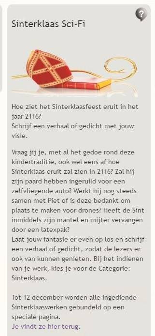 “Bliep bliep… Chriet Titulear 2116 meld zich.” De robot komt zo rijdend de kamer van Sint Nicolaas binnen, die lekker relaxed in zijn luie stoel zit.